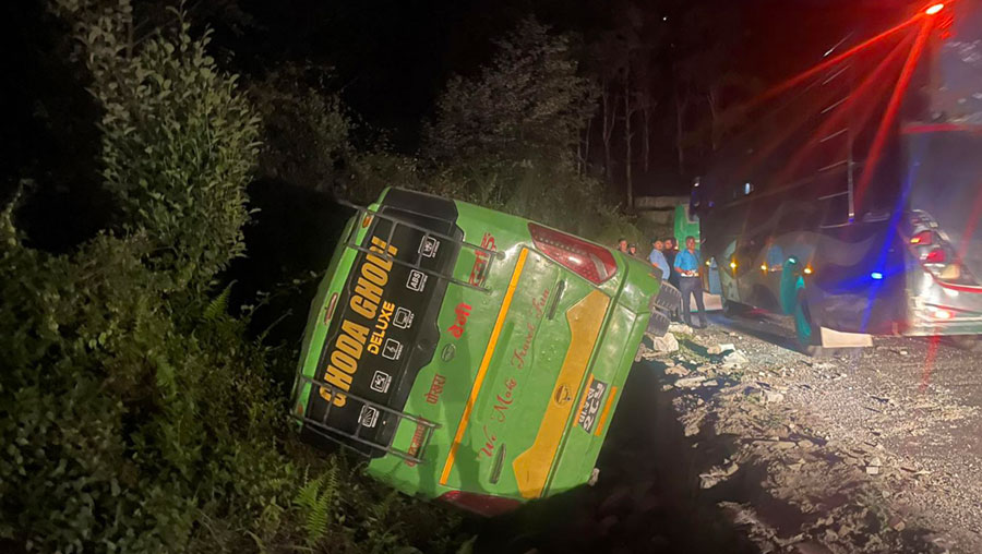बस सडकको दायाँ साइडतर्फ नालामा पल्टिएर दुर्घटनामा परेको प्रहरीको भनाइ छ । अनलाइन खबर