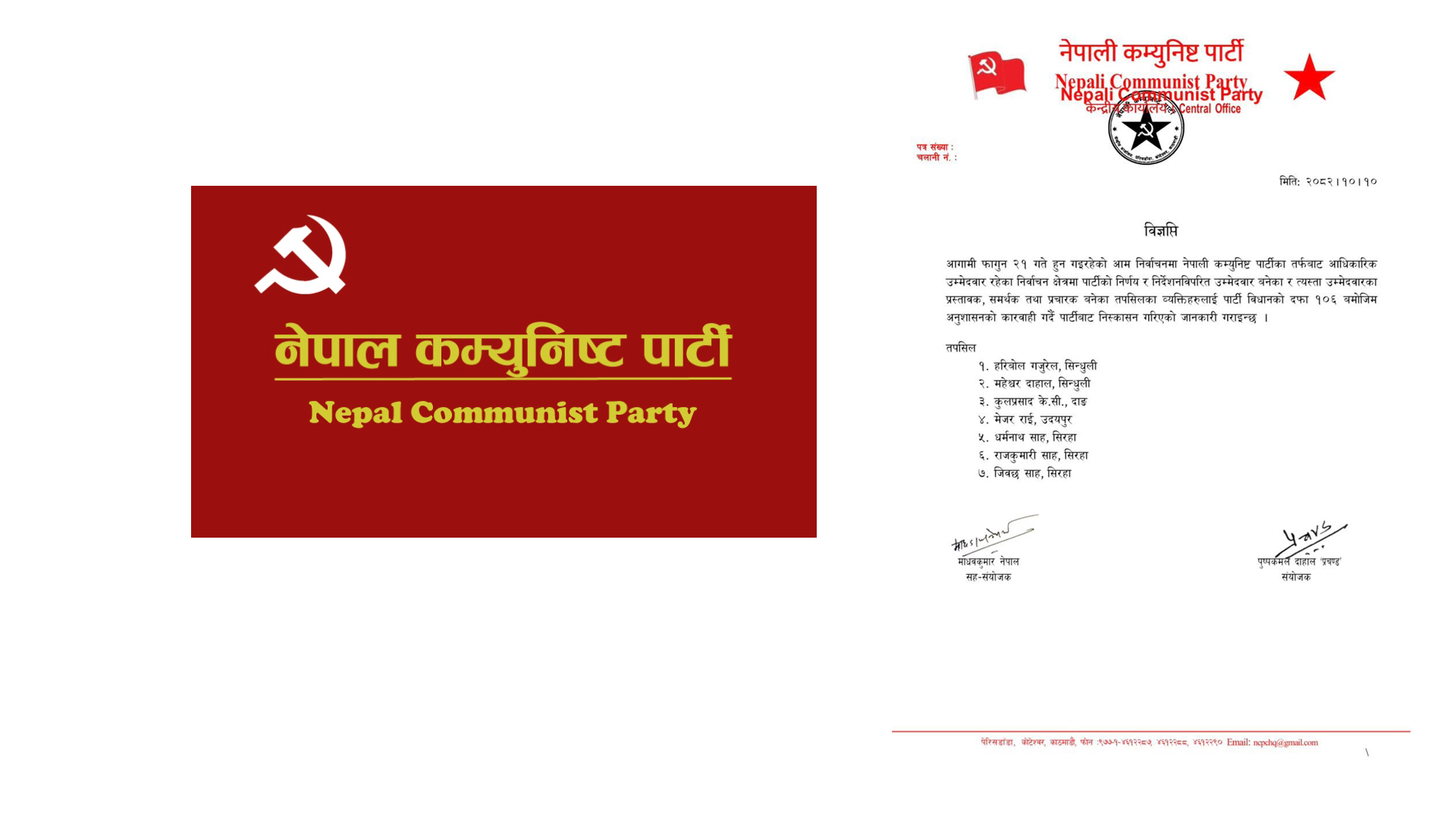 उम्मेदवारी फिर्ताका लागि शुक्रबार बिहान १० बजेदेखि दिउँसो १ बजेसम्मको समय तोकिएको थियो। त्यस अवधिमा उम्मेदवारी फिर्ता नभएपछि शनिबार संयोजक प्रचण्ड र सह–संयोजक माधव नेपालले कारबाही गरिएको सूचना जारी गरेका हुन् । दाङमा नेकपाले मेटमणि चौधरीलाई उम्मेदवार बनाएको थियो । त्यसमा असन्तुष्ट पूर्वमुख्यमन्त्री कुलप्रसाद केसीले उम्मेदवारी दिएका थिए। उनलाई पनि शनिबार पार्टीबाट निस्कासन गरेको हो । सौजन्य जनकपुर टुडे