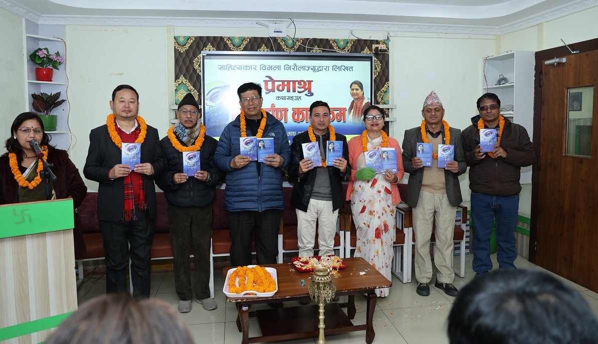 काठमाडौँ । साहित्यकार विमला ढुंगाना निरौलाको कथासङ्ग्रह ‘प्रेमाश्रु’ लोकार्पण गरिएको छ । सोमबार काठमाडौँमा एक विशेष कार्यक्रमबिच स्रष्टा समाजका अध्यक्ष श्रीओम ‘रोदन’, साहित्यकार कृष्ण भुसाल, समीक्षक प्राडा.यज्ञश्वर निरौला, कृतिकार निरौला, साहित्यकार प्रमोद प्रधान लगायतले कृति विमोचन गरे । कार्यक्रममा स्रष्टा विमला निरौलालाई मिलाप कभर सम्मान पनि हस्तान्तरण गरिएको थियो । सङ्गीकार सन्तोष श्रेष्ठ, साहित्यकार सीता पाण्डे, लक्ष्मी उप्रेती, डा.फणिन्द्रराज निरौला र गीतकार संघका अध्यक्ष वसन्त वित्यासी थापाले शुभकामना मन्तव्य राखेको कार्यक्रममा