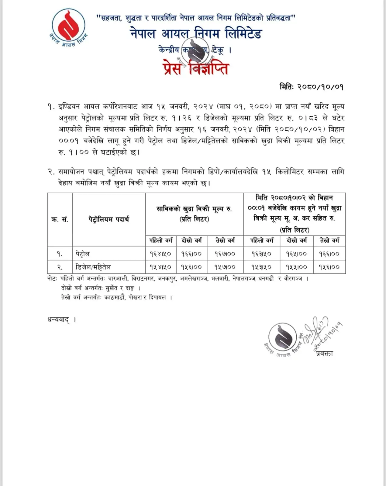पेट्रोल र डिजेलको मूल्य घट्यो