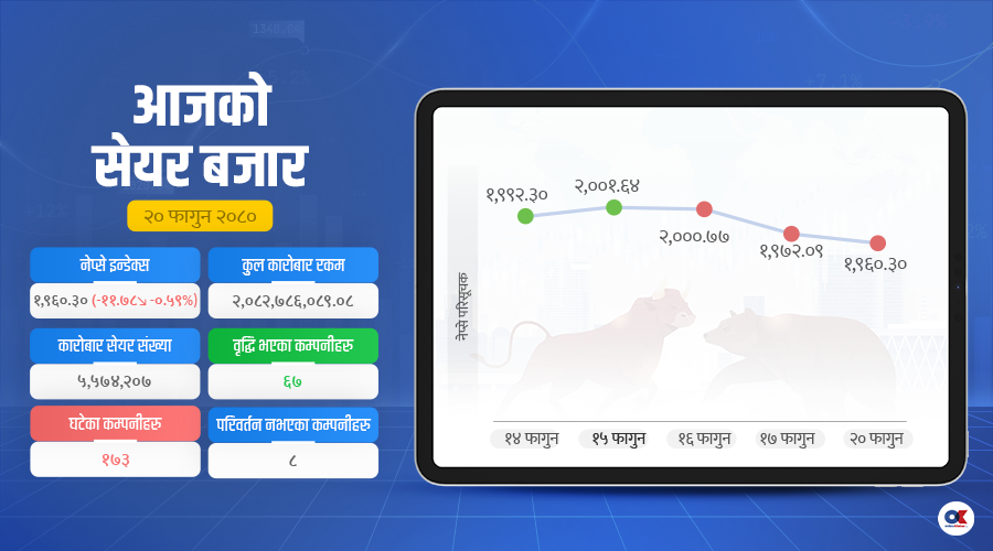१९६० अंकमा झर्यो सेयर बजार, दुई समूहका सूचक बढे