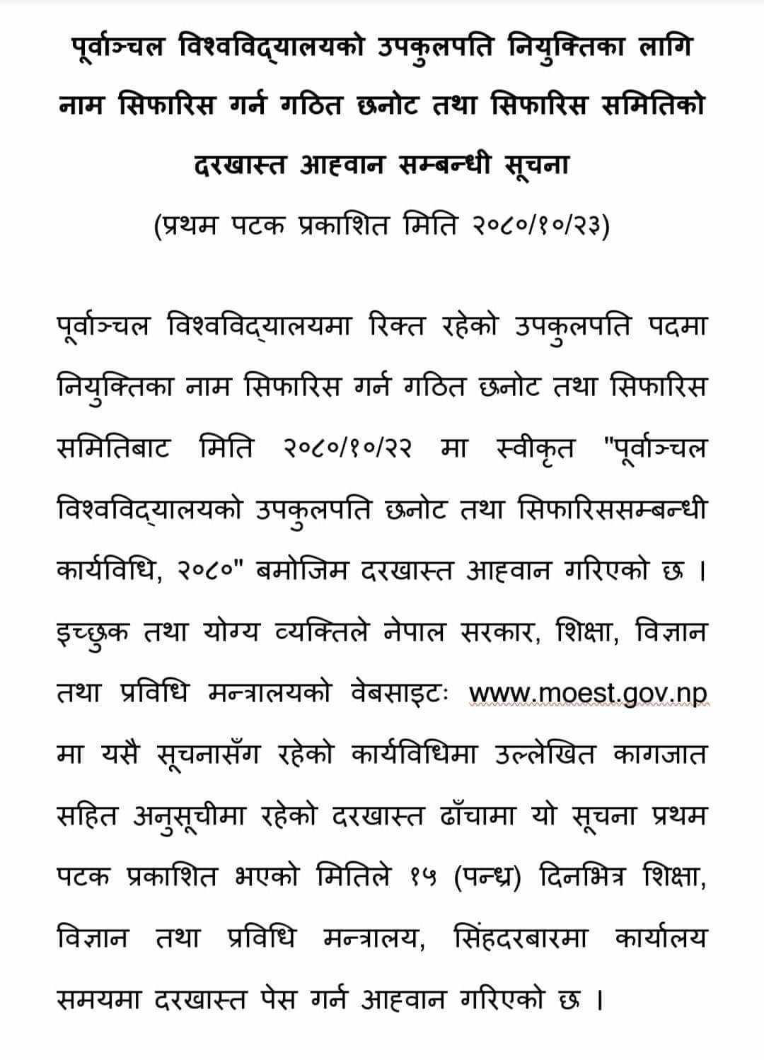 पूर्वाञ्चल विश्वविद्यालयद्वारा उपकुलपतिका लागि आवेदन आह्वान