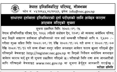 साधारण दर्तावाला इन्जिनियर परीक्षाका लागि आवेदन आह्वान