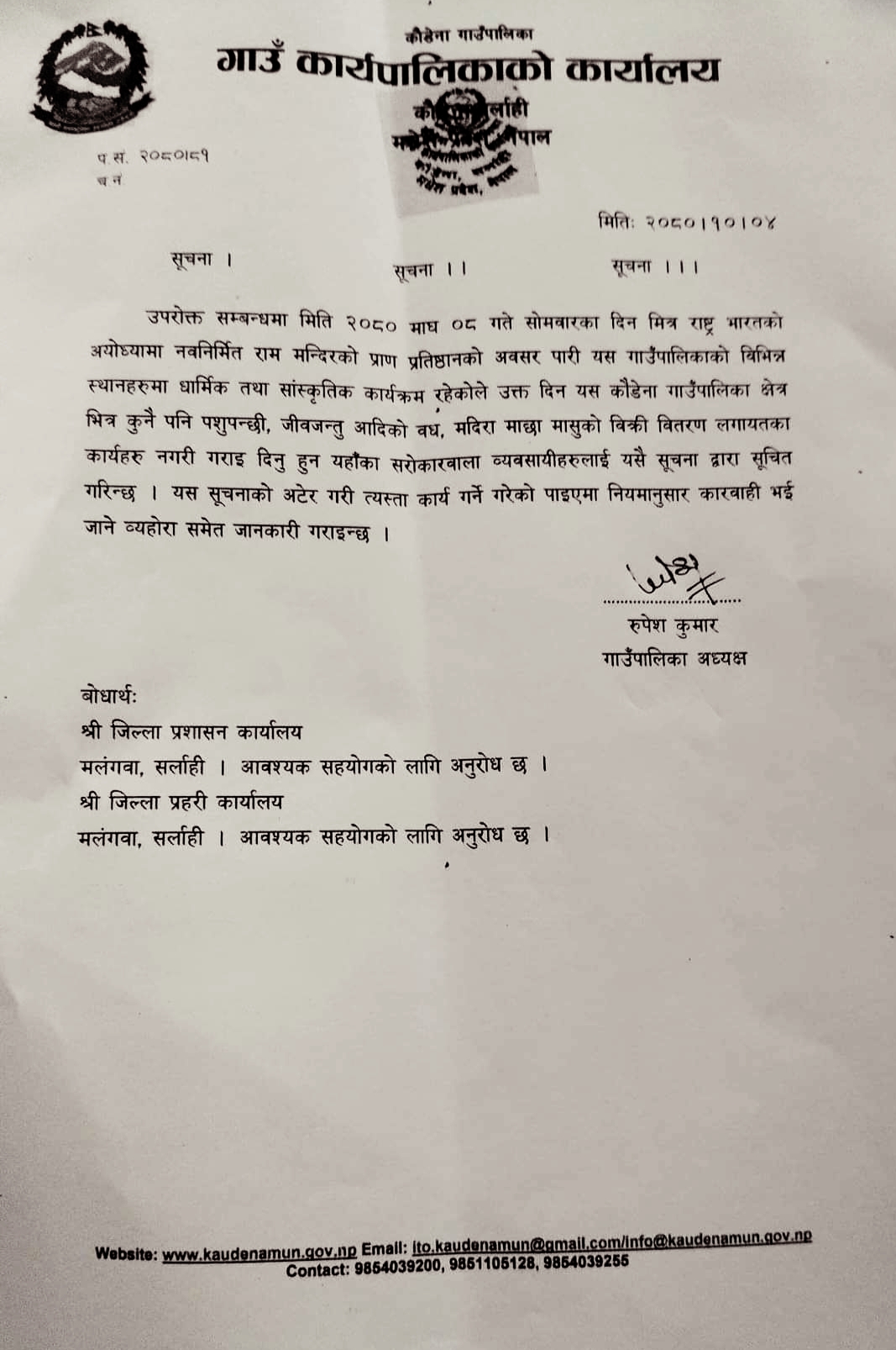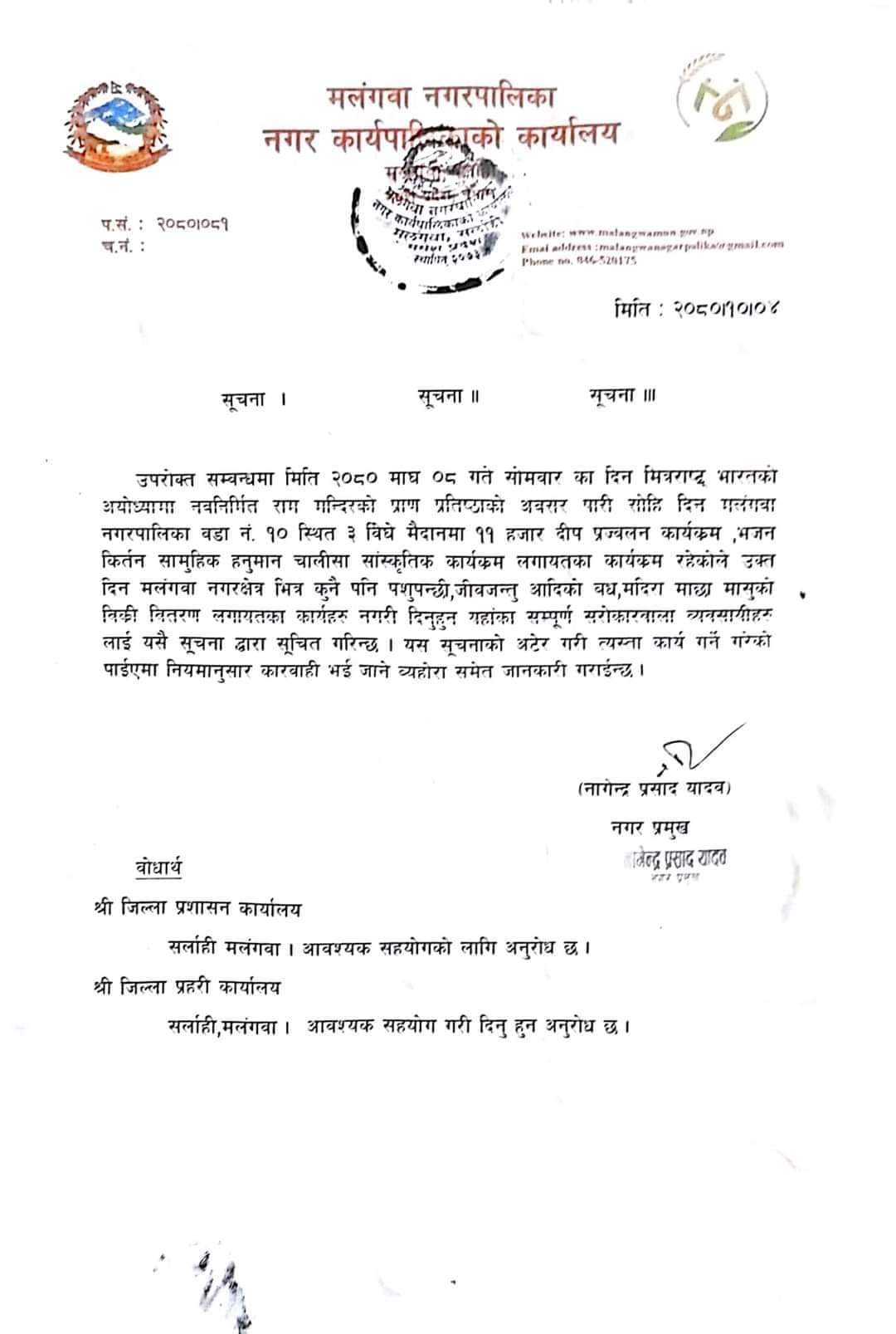 मलंगवा नगरपालिकामा माछा-मासु तथा मदिराको बिक्री वितरणमा रोक