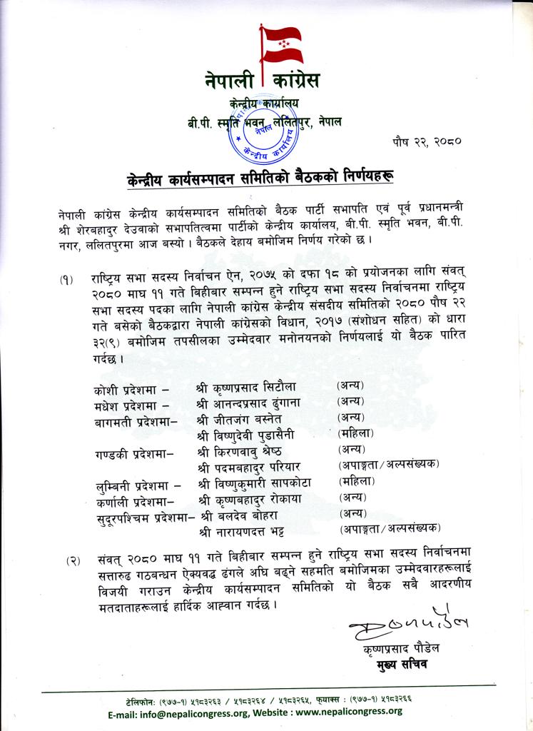 कांग्रेसले छान्यो राष्ट्रिय सभाका १० उम्मेदवार