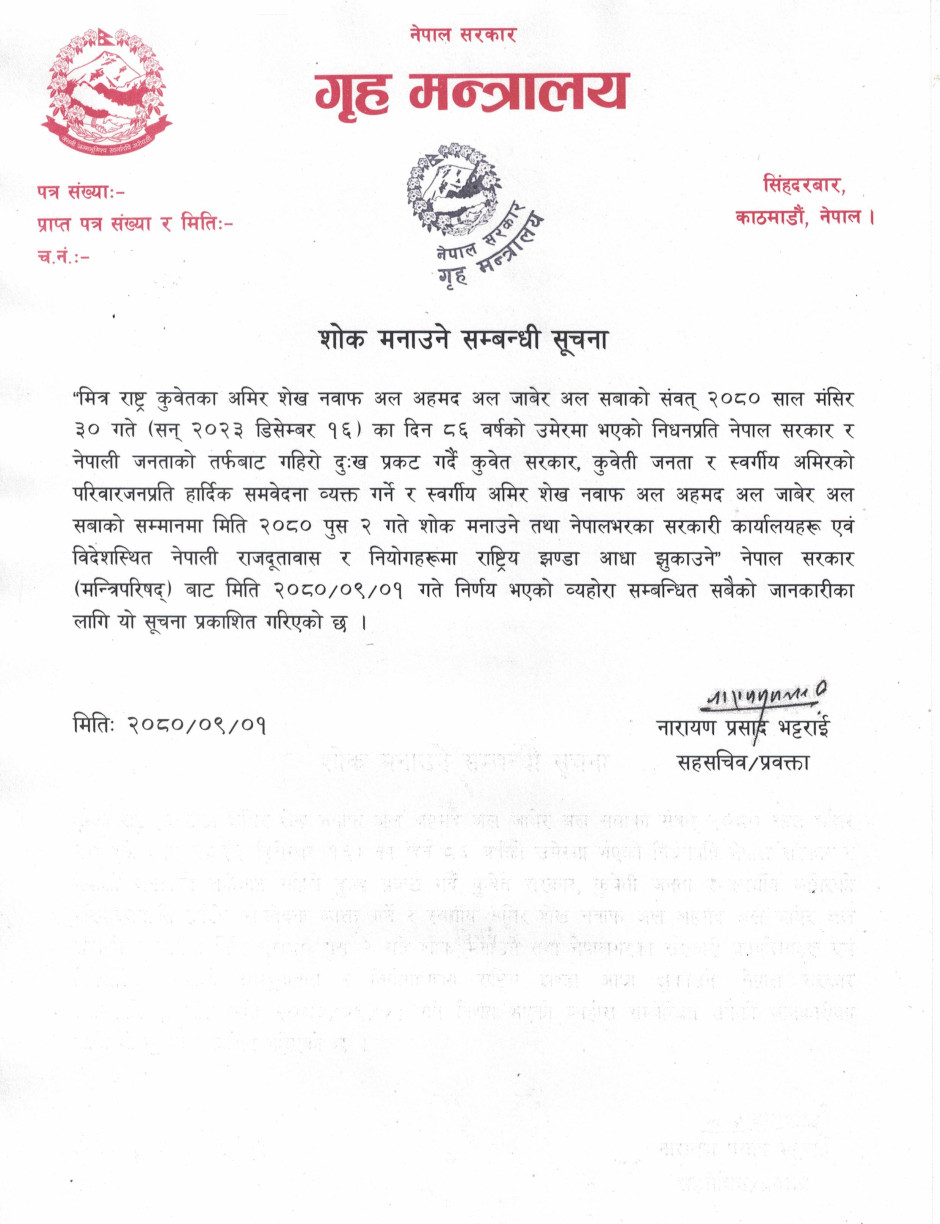 कुवेतका अमिर शेख नवाफको निधनमा सरकारले आज शोक मनाउने*