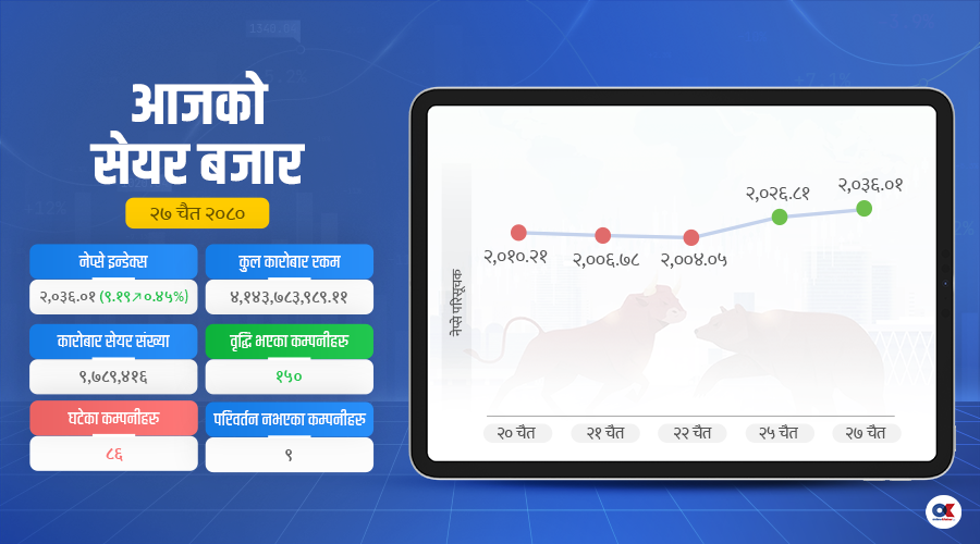 सेयर बजार बढ्यो, ४ अर्ब १४ करोडको कारोबार